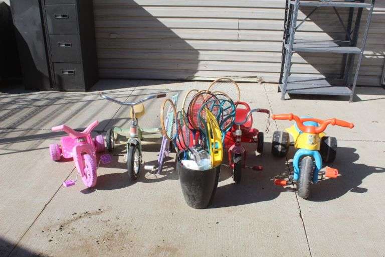 5 little kids trikes & riding toys w/bucket of toys