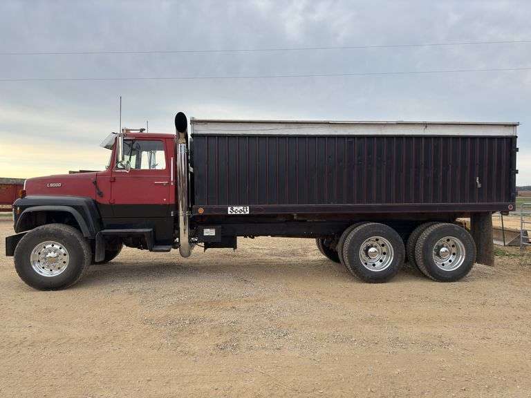 20' hydraulic dump grain box w/ tarp, excellent 11R24.5 tires, tandem duals, air brakes, new clutch last year, meter reads 72,014 miles. 10L Cummins Diesel. VIN# 1FDZU90L7LVA27466