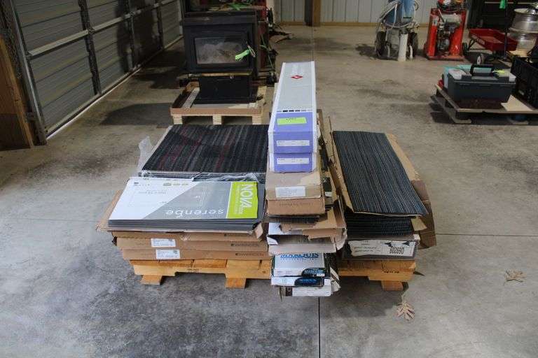 Pallet of various vinyl plank flooring, carpet squares & rectangles, new, full & partial boxes, not all the same