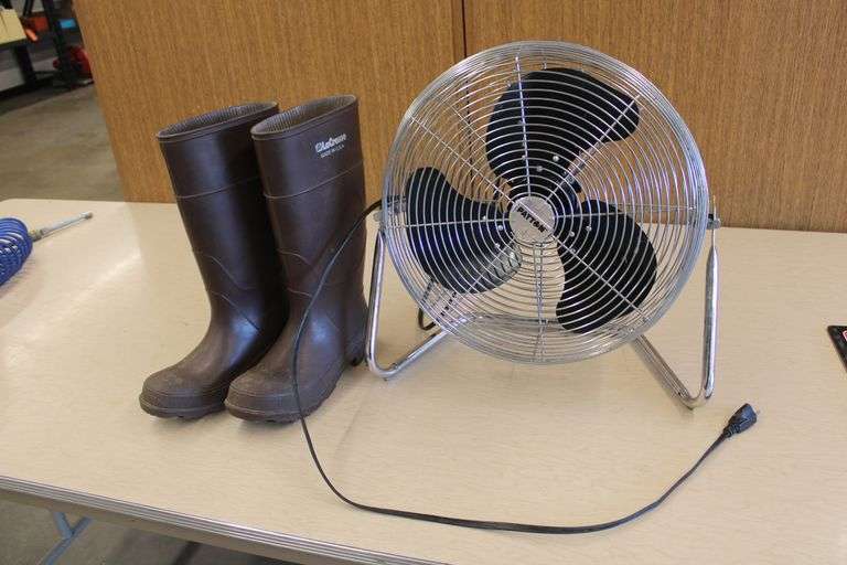 14" elec. floor fan & Size 8 rubber LaCross boots