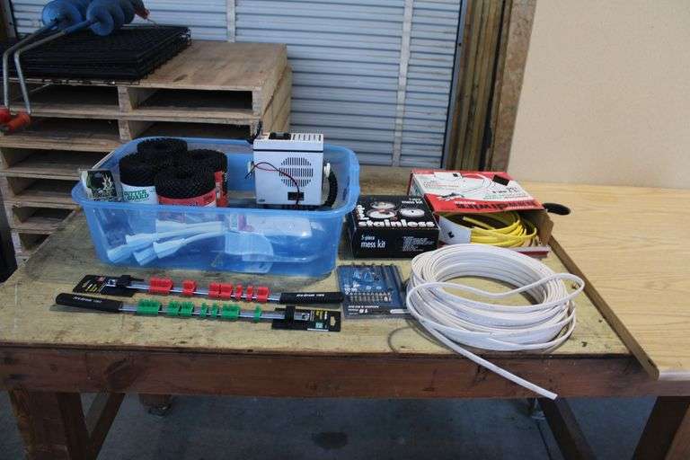 LOT 1160 - Tote of elec. wire, tools, leaf guard & CB radio