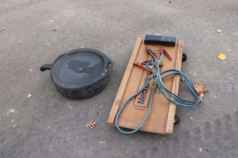 LOT 1286 - Creeper, jumper cables & oil catch pan
