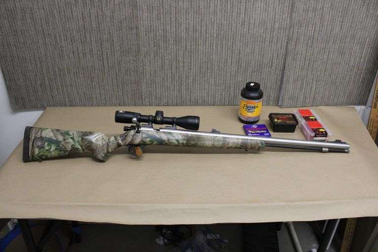 52 cal. D.I.S.C. Extreme Black Powder Only rifle w/camo synthetic stock, Nikon Omega 3-9 x 40 rifle scope, bullets, powder & primers